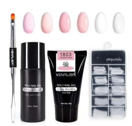 1. Complete Poly Gel Kits: – 6 poly nail extension gel colors: clear, soft pink, nude, baby pink, gray, black, white crystal. Base and top coat, 100pcs dual nail forms, slip solution, nail file, nail brush pen, UV led lamp. With everything for beginners, Everyone can easily sculpt and create amazing nails at home instead go to the salon.